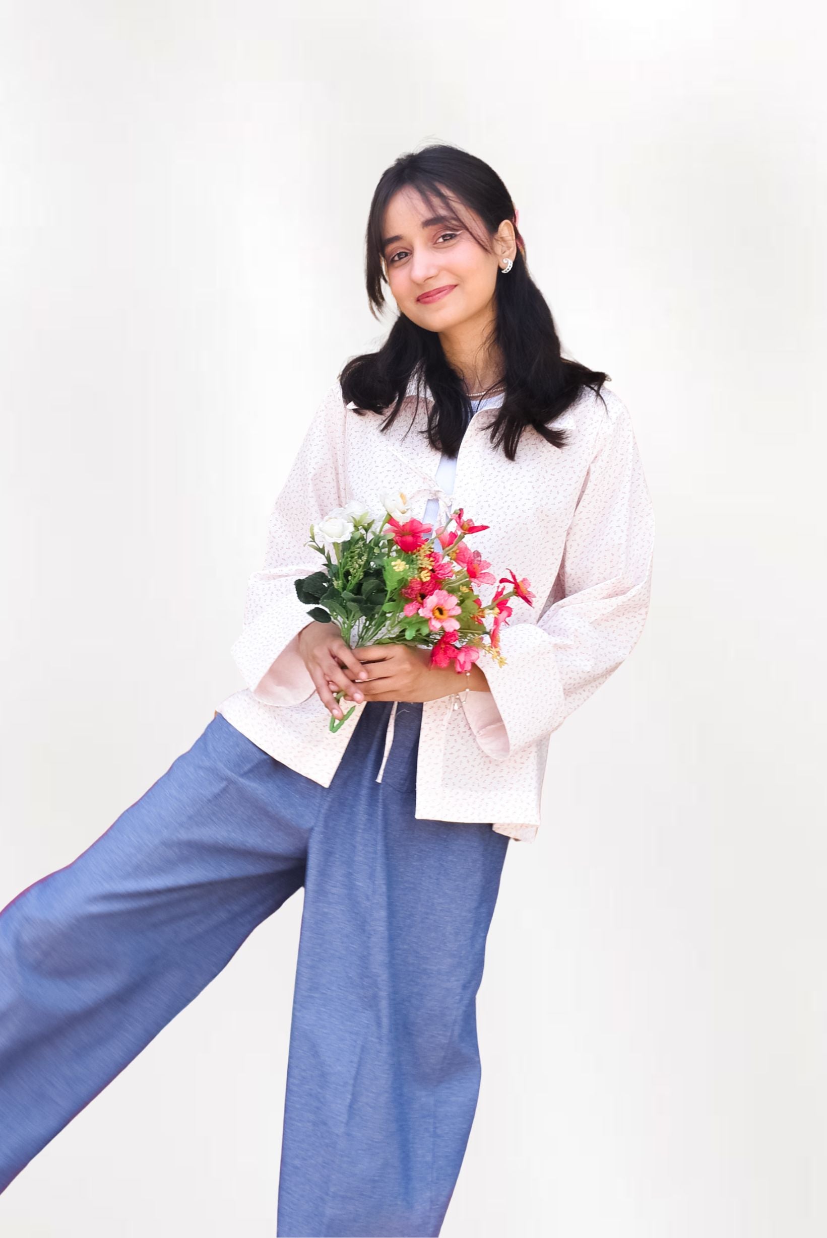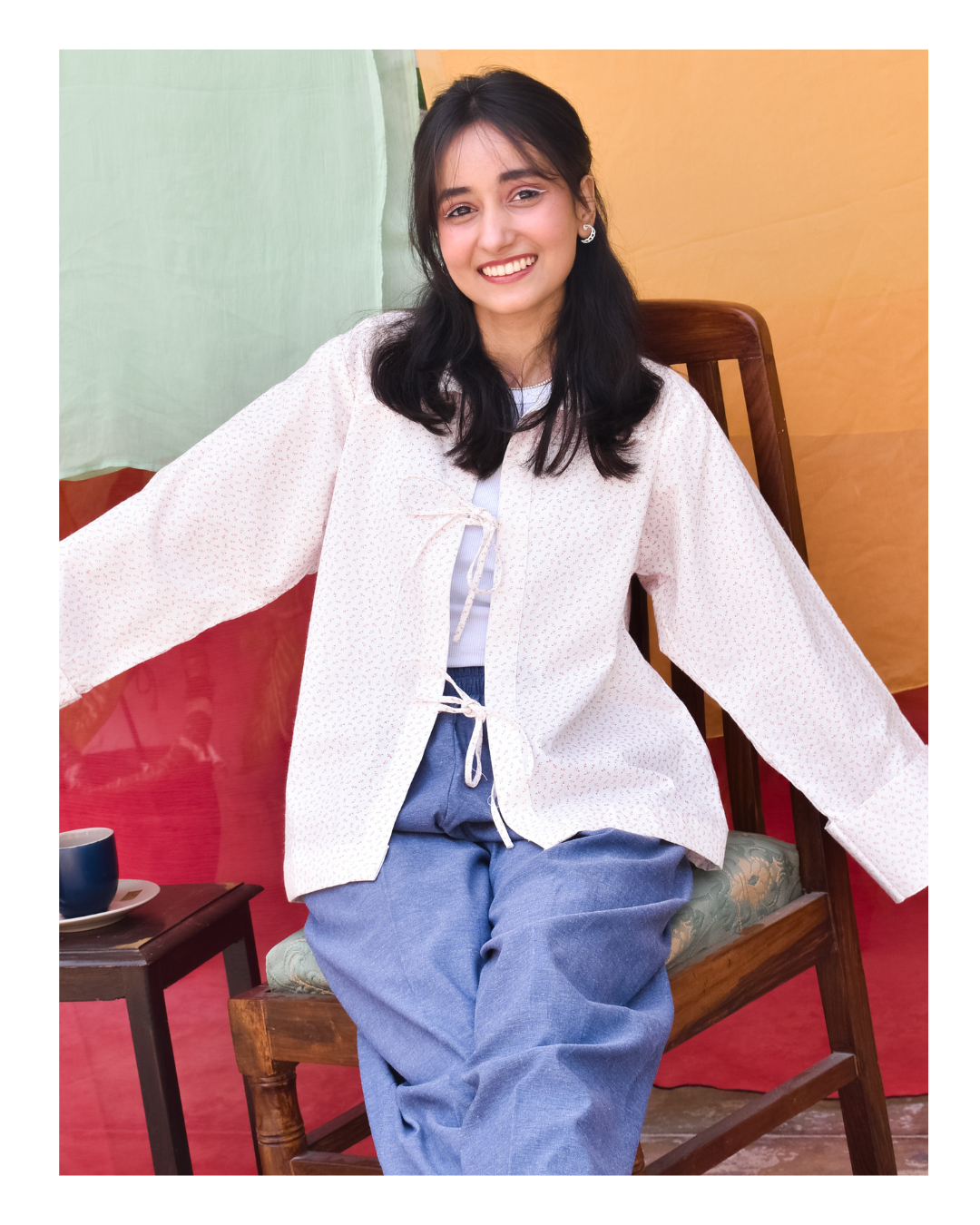 A relaxed fit shirt with a tie-front design and long folded sleeves. It’s made from soft, lightweight fabric, perfect for warm weather.