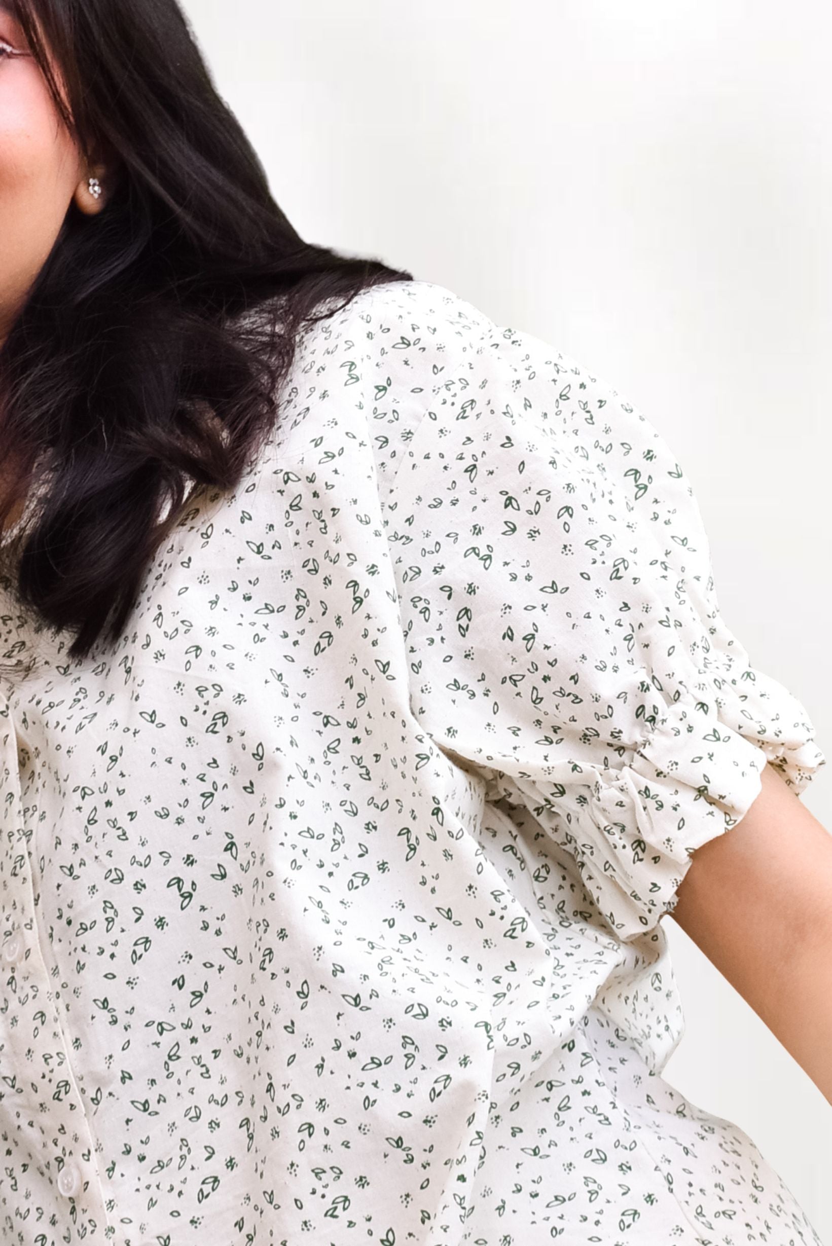 A lightweight blouse with soft, printed fabric. Designed with charming puff sleeves, a classic collar, and a front button-down closure, it combines a vintage-inspired look with modern comfort.